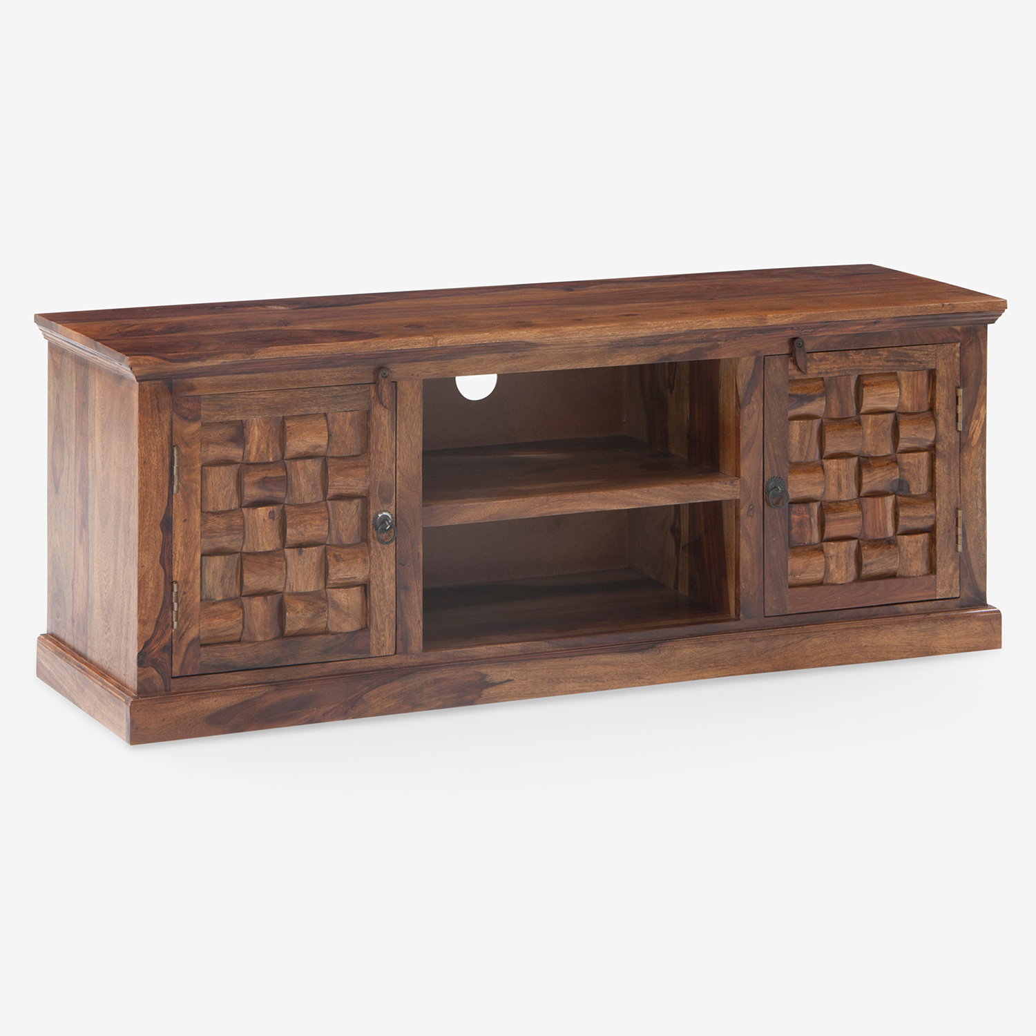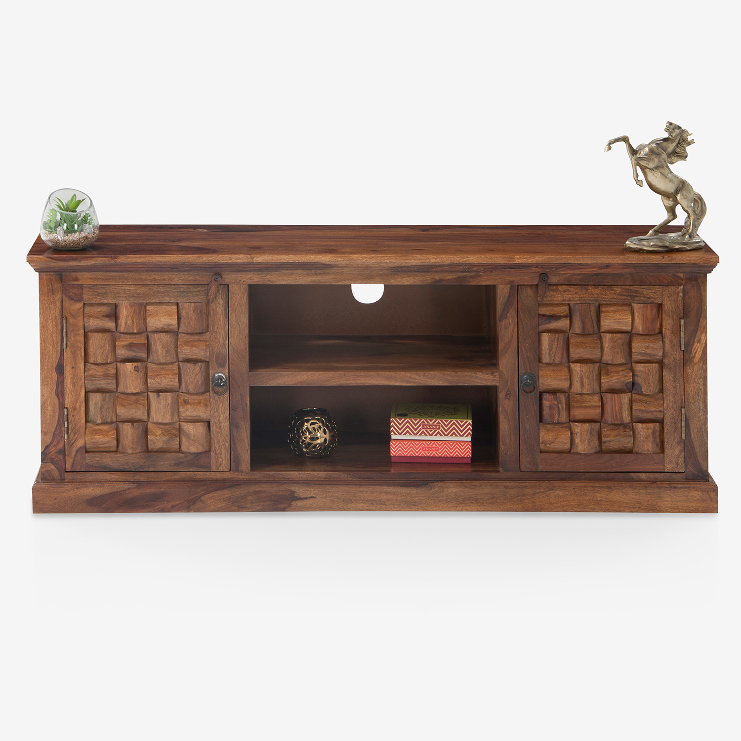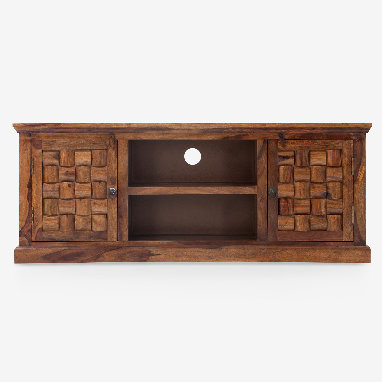 Add a touch of sophistication to your living room with the Majestic Furniture Wooden TV Stand, a stylish and functional piece designed to elevate your entertainment space. This TV stand features cupboards on both sides, an open center shelf with a middle horizontal partition, and striking 3D checkered interwoven brick pattern detailing on the doors.