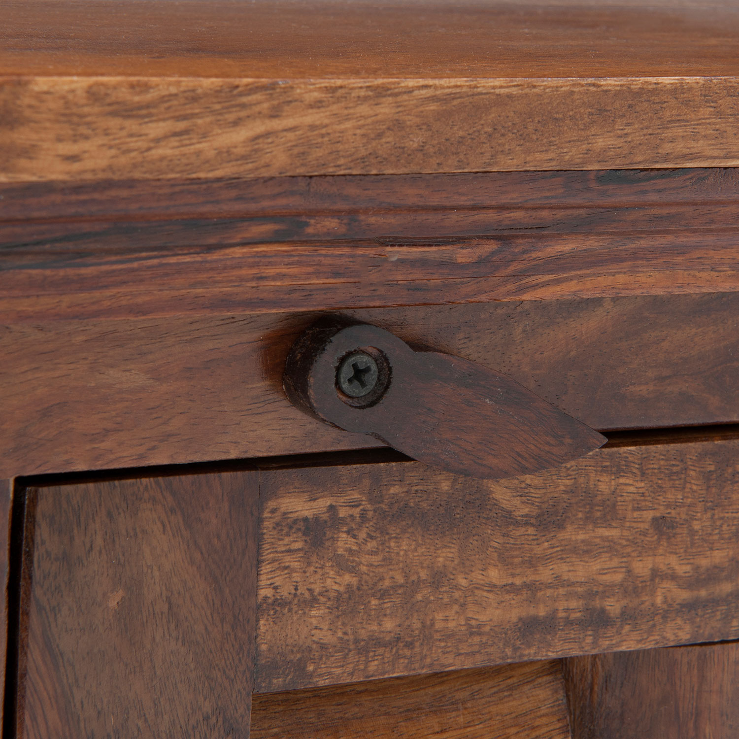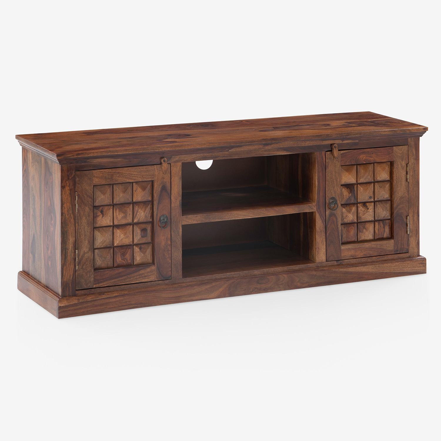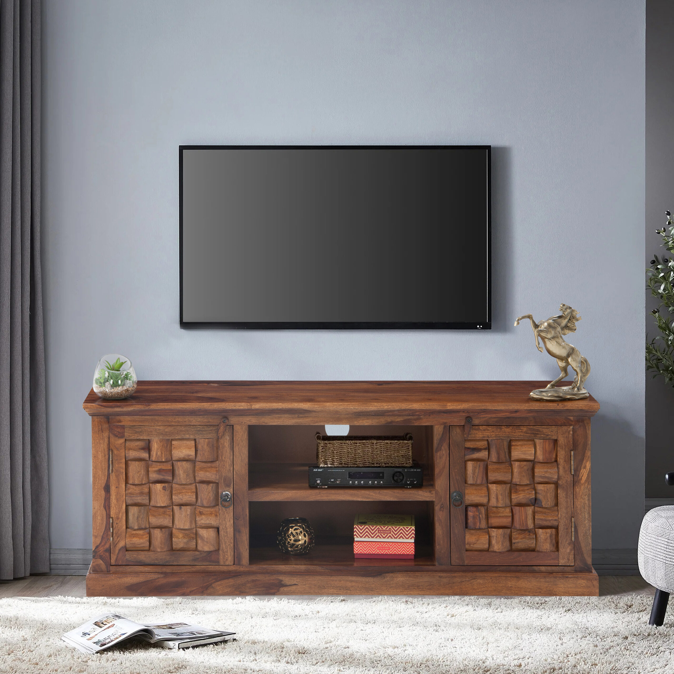 Add a touch of sophistication to your living room with the Majestic Furniture Wooden TV Stand, a stylish and functional piece designed to elevate your entertainment space. This TV stand features cupboards on both sides, an open center shelf with a middle horizontal partition, and striking 3D checkered interwoven brick pattern detailing on the doors.