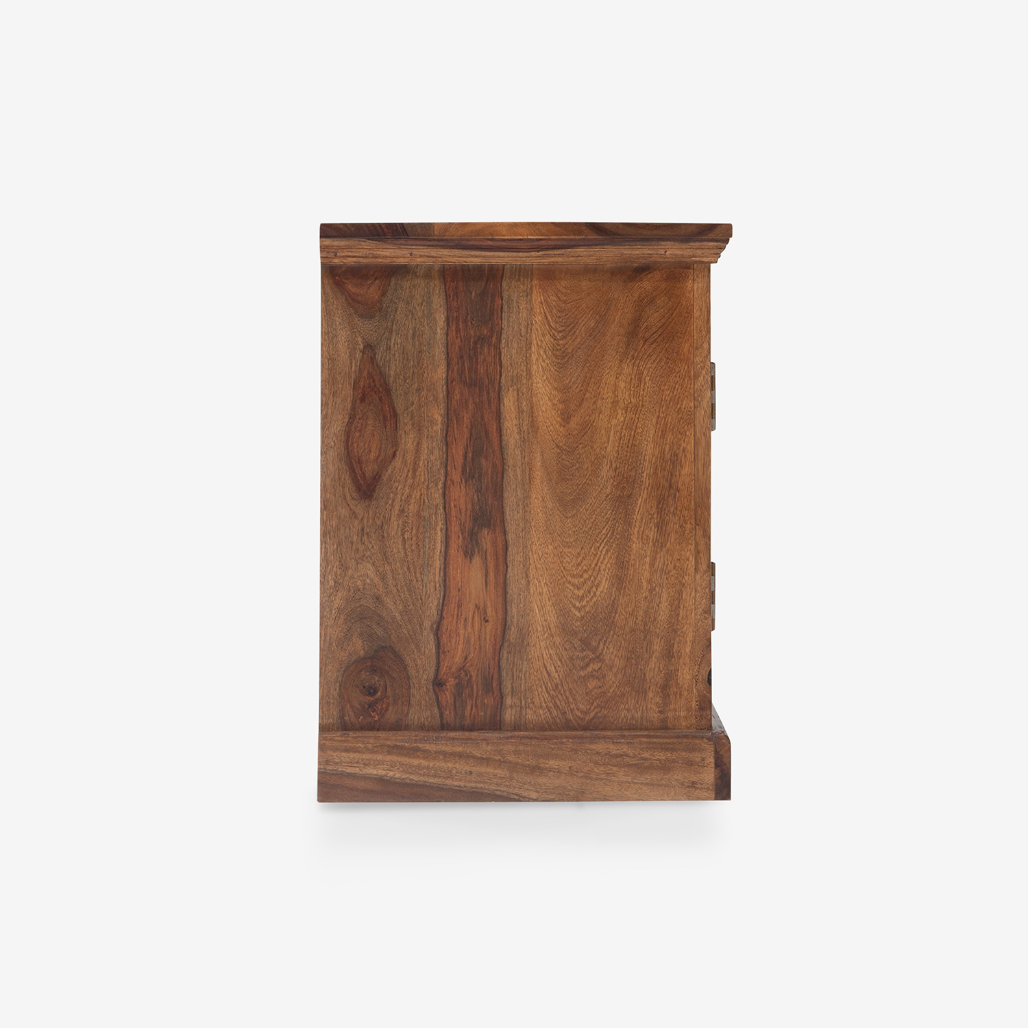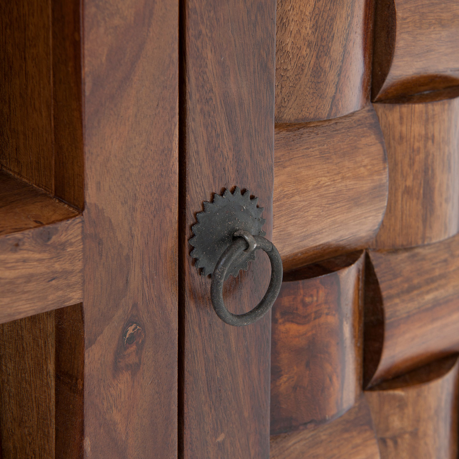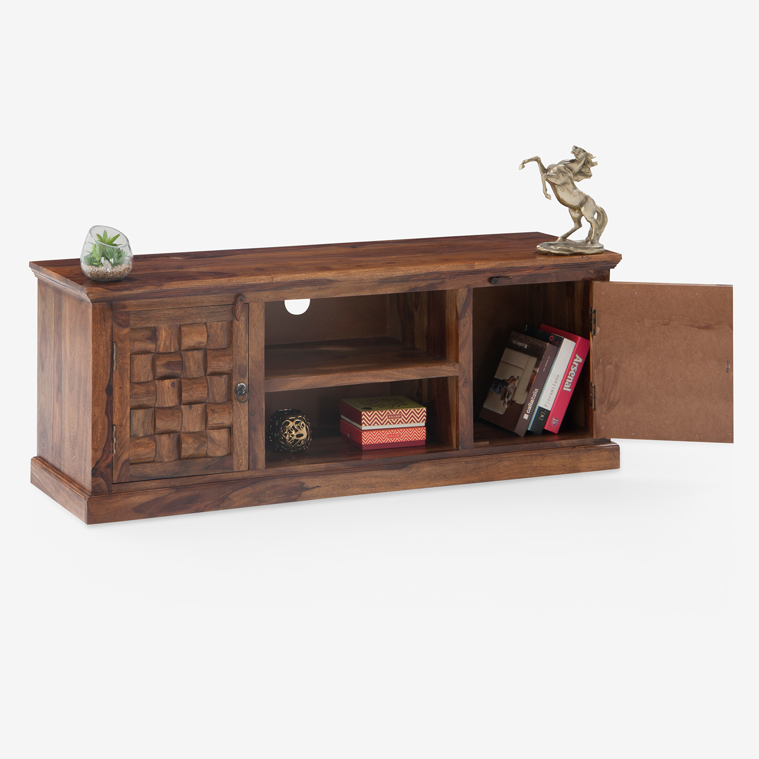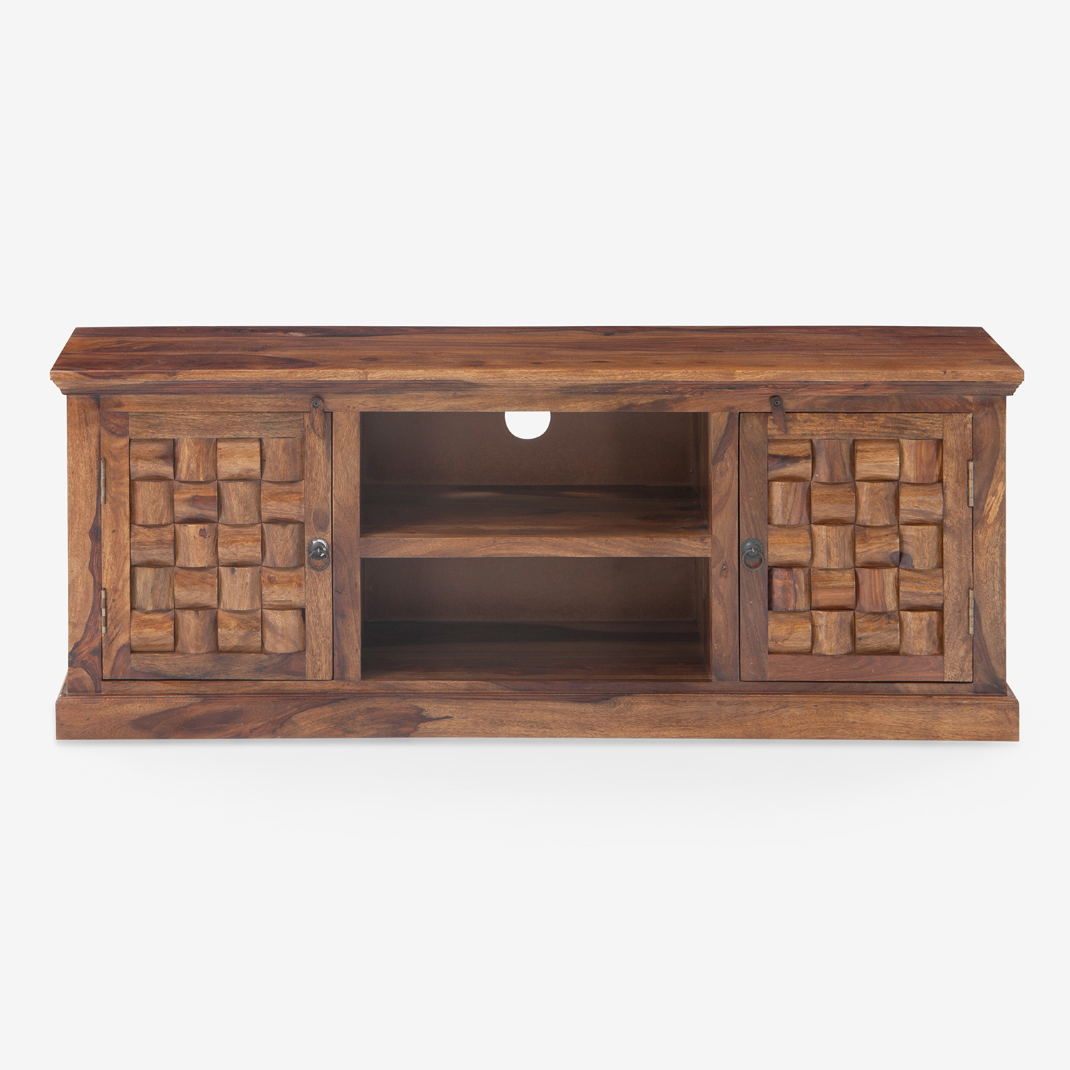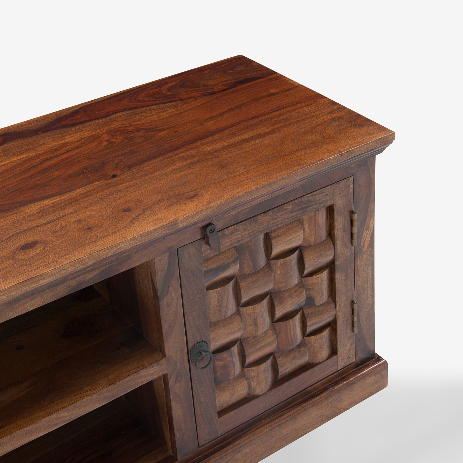 Striking Design: The standout feature of this TV stand is its 3D checkered interwoven brick pattern detailing on the cupboard doors, adding depth and visual interest to the piece while enhancing its aesthetic appeal.